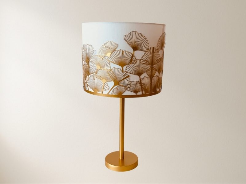 A delicate fusion of East and West. This medium-sized lamp features a crisp white drum shade, elegantly adorned with a band of golden, see-through floral motifs. The translucent flowers glow beautifully when lit, creating a soft, artistic light perfect for a serene ambiance. (16″H x 10″W)