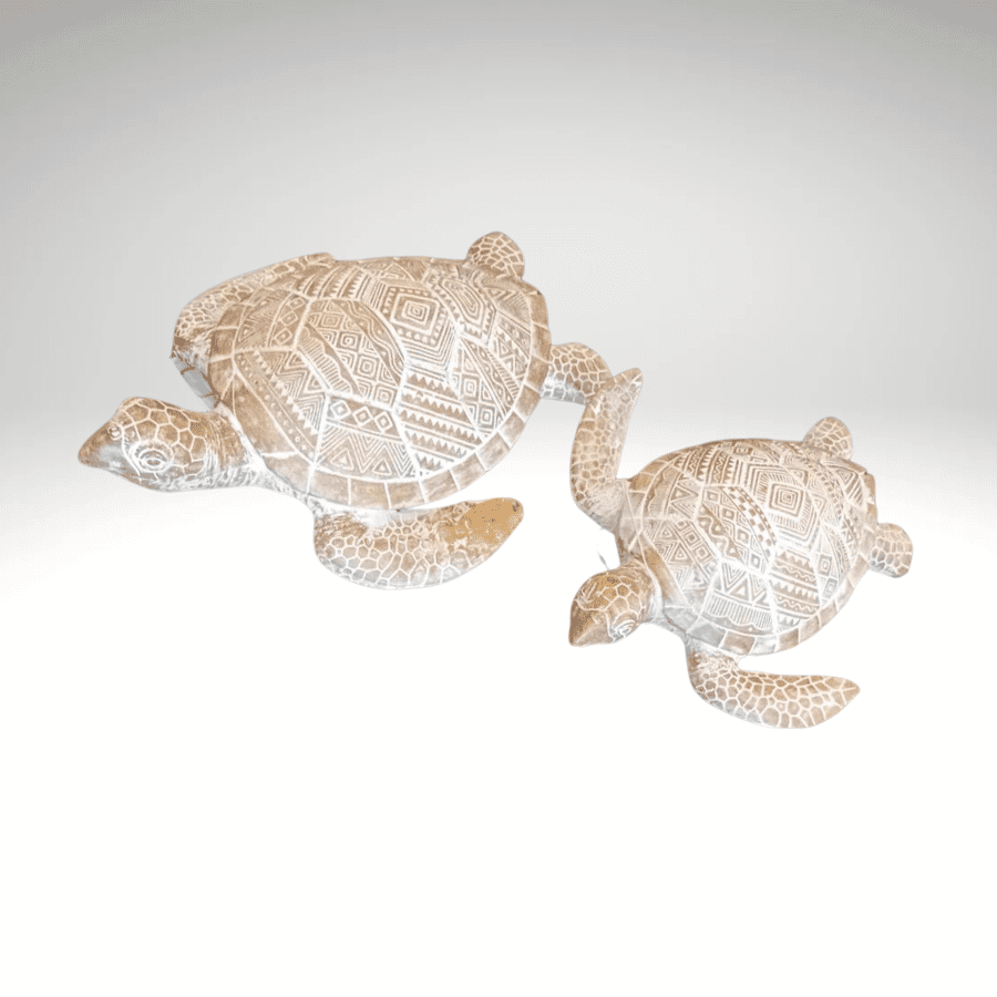 A pair of elegant coastal companions, crafted in the same artistic spirit. Made from durable, textured resin, each turtle is meticulously carved with organic geometric patterns across its shell, evoking the beauty of sun-dappled waves and tidal textures. Their smooth, flowing forms and artisanal detail bring a serene, oceanic vibe to any shelf, console, or side table. These sculptures are more than decor—they are tactile pieces of coastal art that invite calm and connection to the sea.