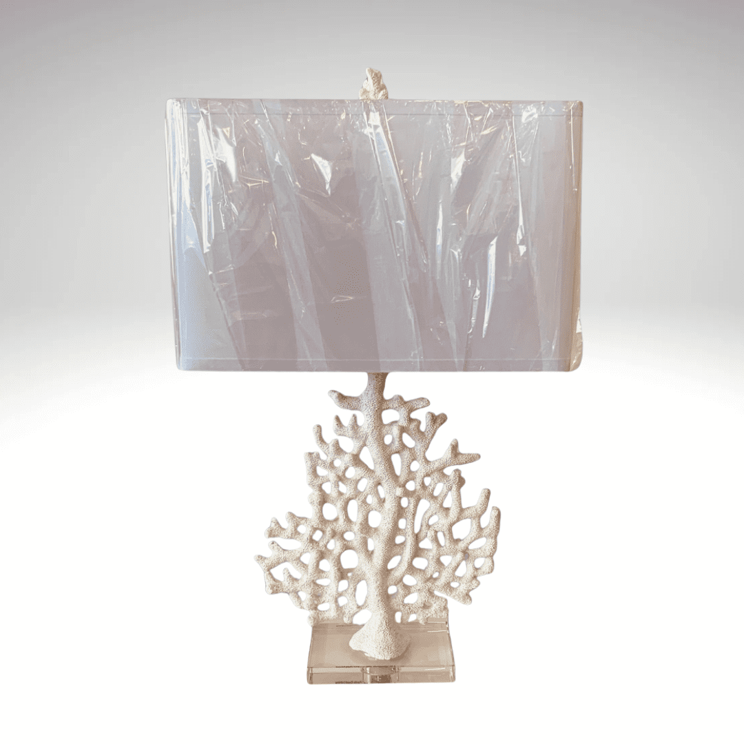 A beautifully detailed lamp featuring a sculpted coral fan base and a soft rectangular shade. Brings a serene, ocean-inspired glow and coastal charm to any space.