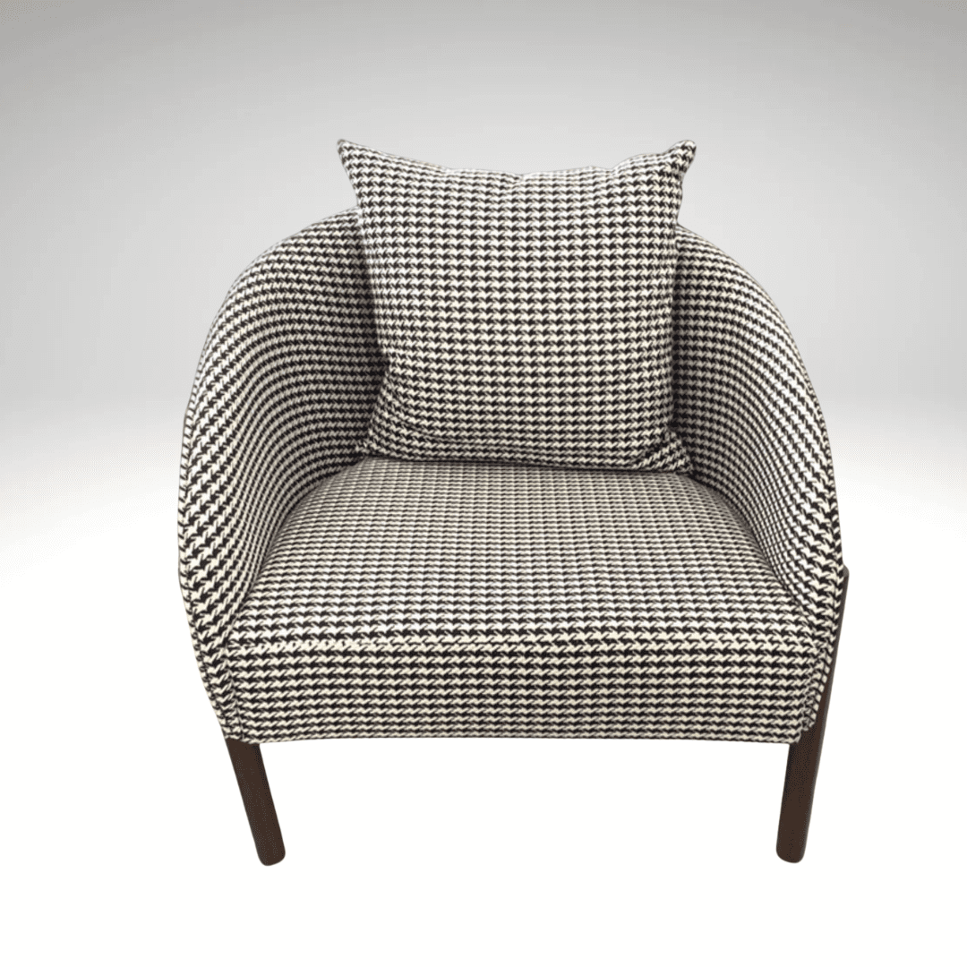 Designed as a single, elegant curve. This chair features a seamless silhouette where the armrest flows continuously into the backrest, creating a secure and embracing feel. Upholstered in a tailored black and white small-square fabric, it adds a crisp, graphic punch of contemporary deco style. Beneath the striking look is serious comfort: a wide, deep seat and a solid hardwood frame ensure it’s as supportive as it is stylish. A modern statement piece that doesn’t compromise on coziness.