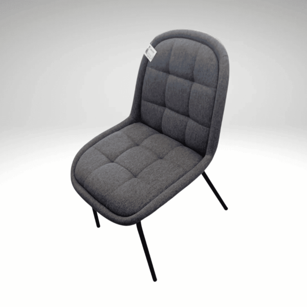 A clear nod to timeless design, merging mid-century form with contemporary comfort. The chair features a classic rounded “bucket” silhouette, elevated by elegantly splayed black metal legs that ensure stability and visual lightness. Upholstered in a durable, dark grey fabric with a subtle linen-like texture, it is both stylish and practical for daily use. The quilted padding on the seat and back adds a plush touch, supported by a firm foam core that maintains its sculpted shape. A perfect blend of iconic style, clean lines, and all-day comfort for your dining or workspace.
